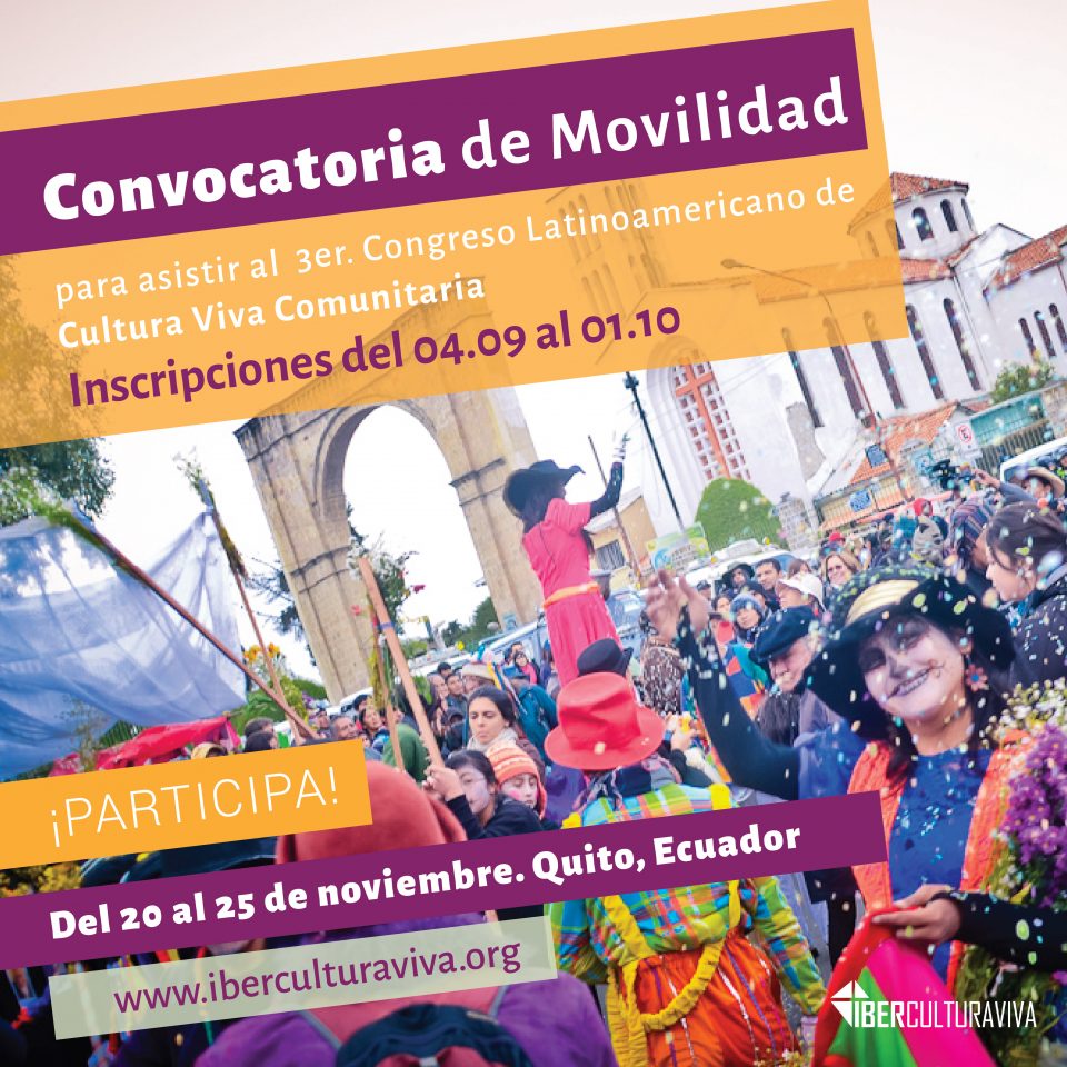 El programa IberCultura Viva abre inscripciones para la Convocatoria de Movilidad 2017, dirigida a las organizaciones interesadas en participar del 3º Congreso Latinoamericano de Cultura Viva Comunitaria, que se realizará del 20 al 25 de noviembre en Quito, Ecuador. El evento está organizado por la Red de Cultura Viva Comunitaria Ecuador y tiene como uno de sus principales objetivos trabajar el “Ser comunitario”.