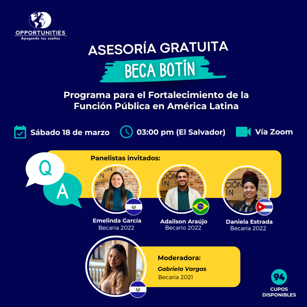 Si deseas acompañamiento en tu aplicación, inscríbite en la Asesoría gratuita que hemos organizado en Opportunities, en donde tendrás la oportunidad de hacer consultas directas con exbecarios Lartinoamericanos de este programa.