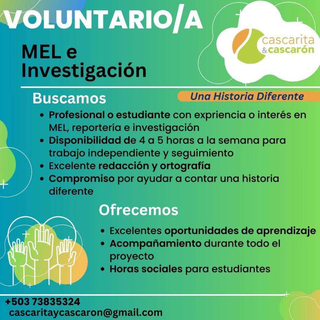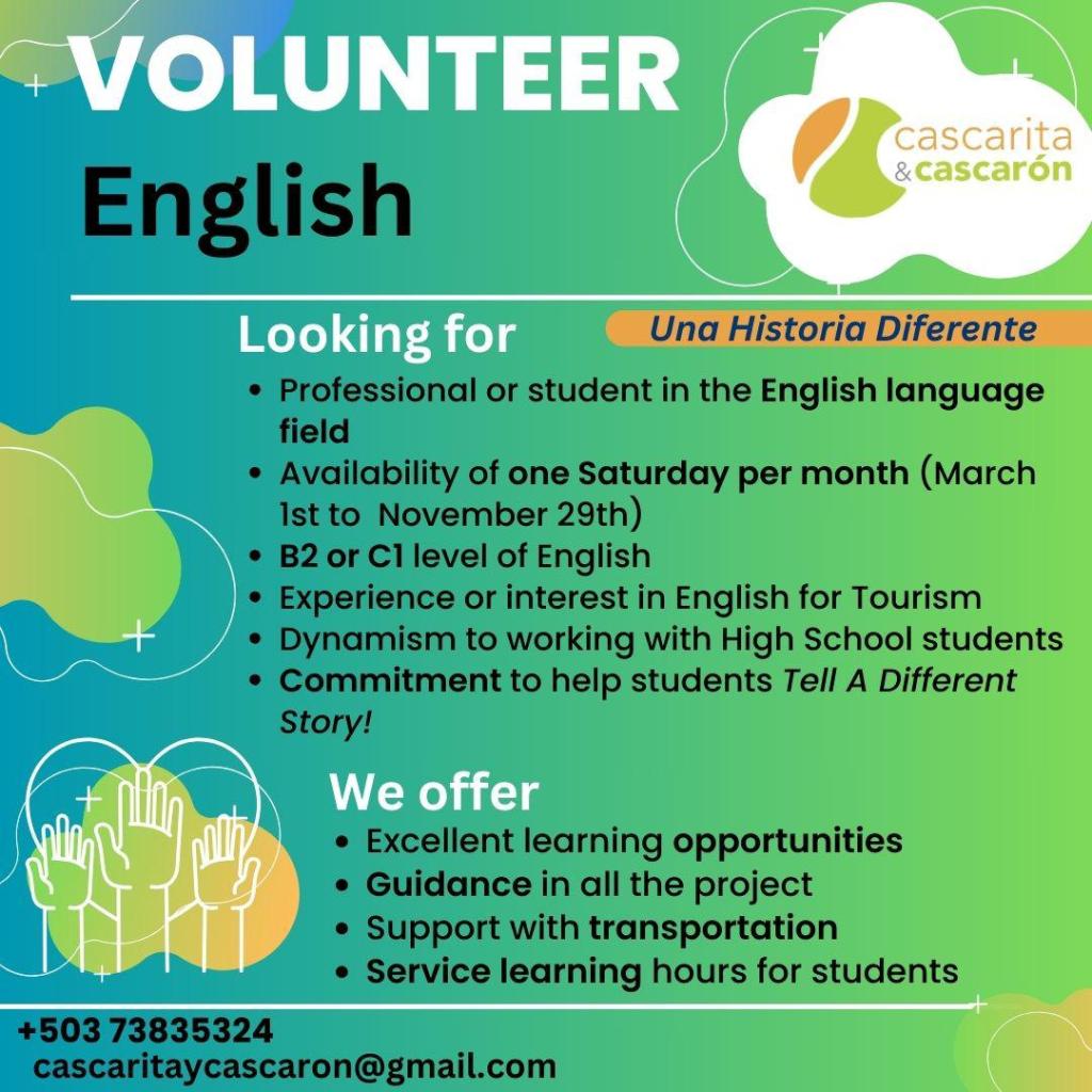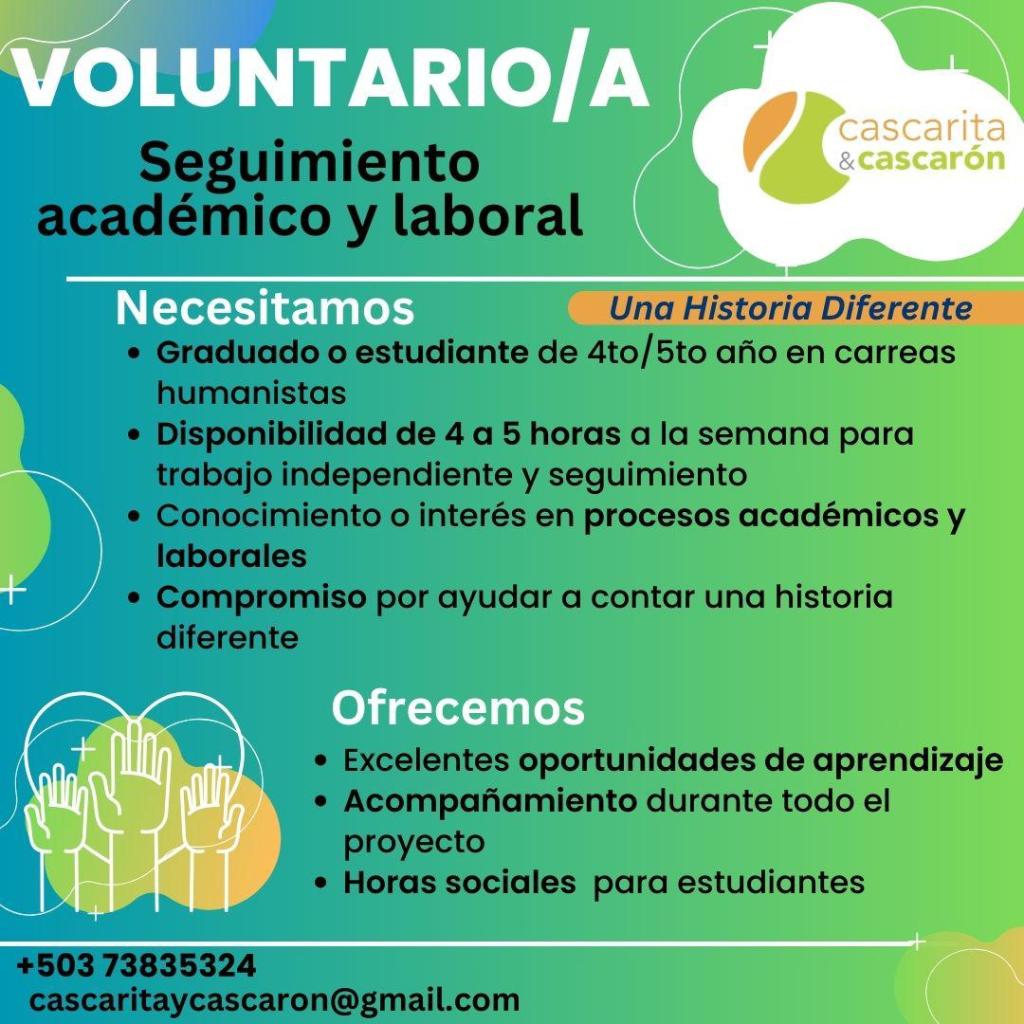 La organización Cascarita & Cascarón busca a personas voluntarias para apoyar su programa de becas, Una Historia Diferente, dirigido a jóvenes de bachillerato en Teotepeque y Jicalapa, La Libertad, El Salvador.